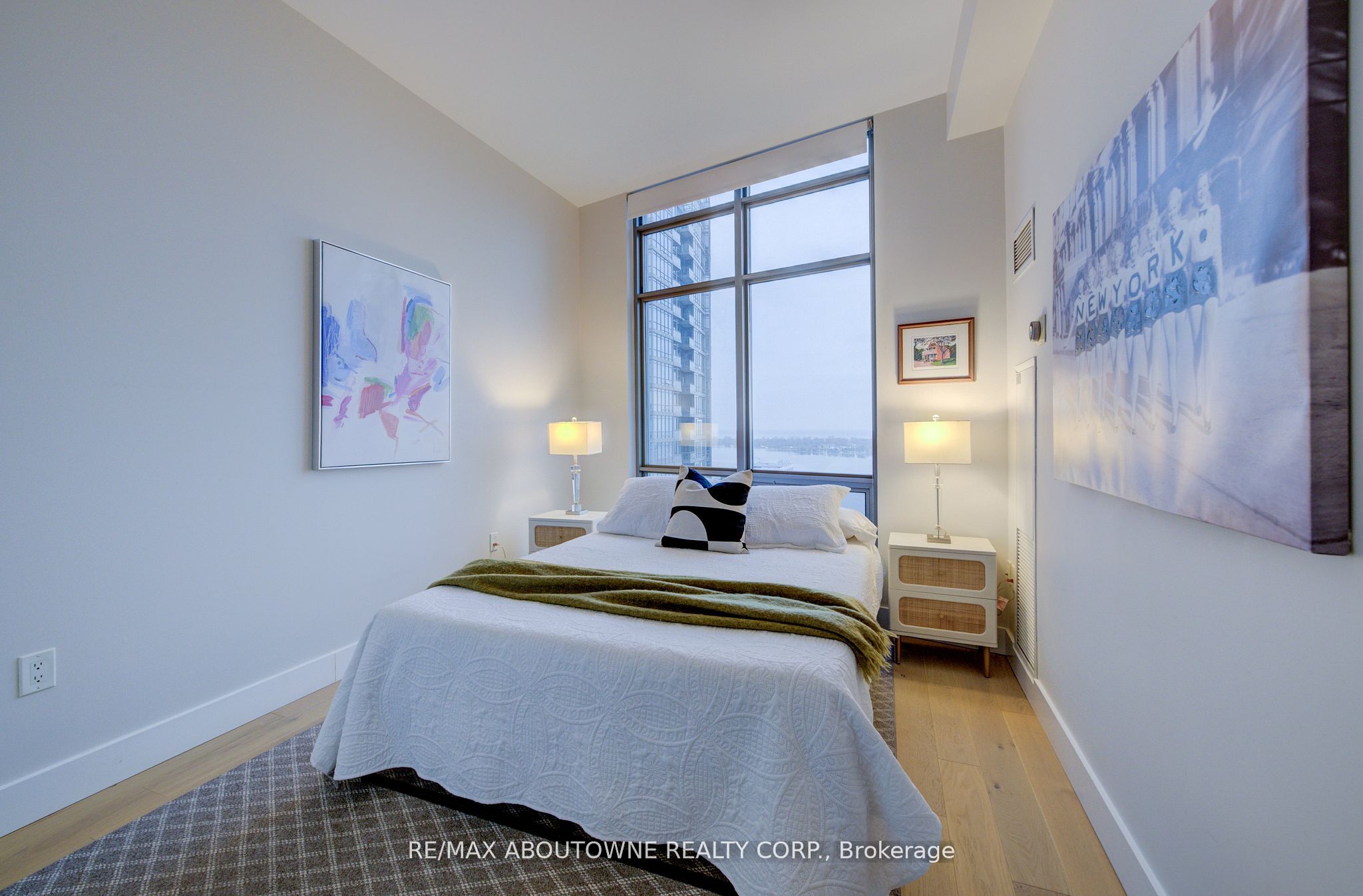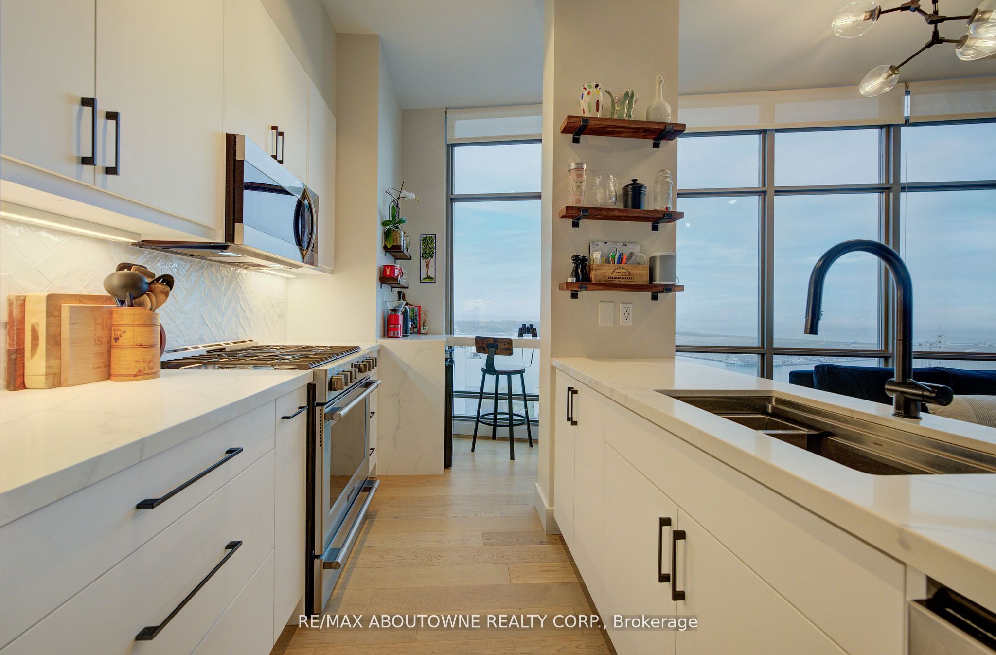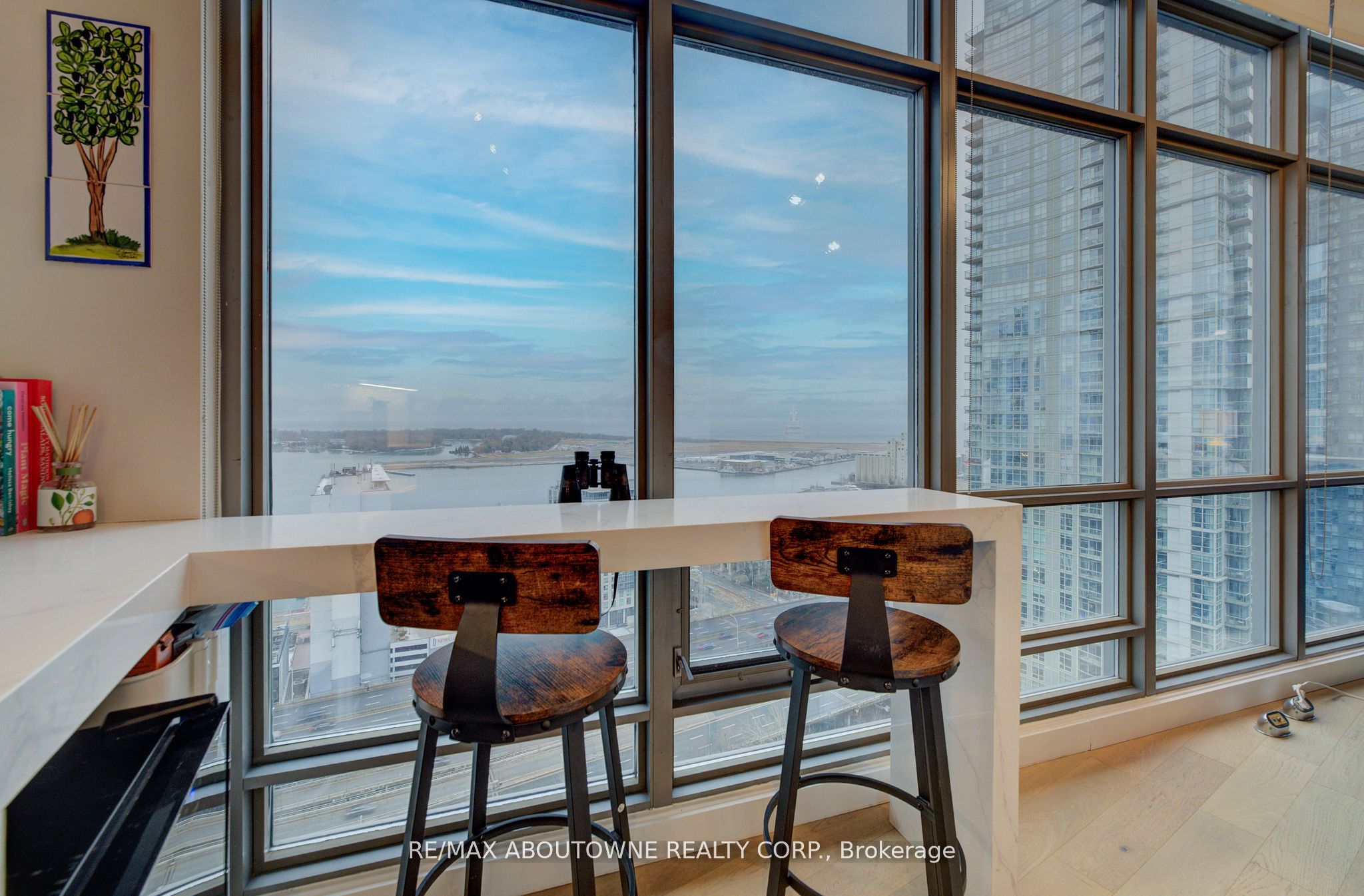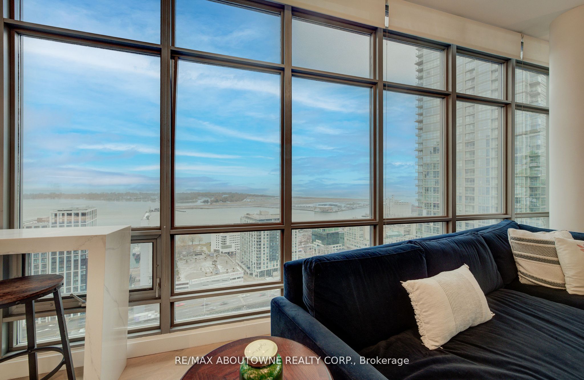 Live at the Lake in a rare Penthouse Corner Suite. Experience elevated living in this stunning penthouse suite featuring 10-ft floor-to-ceiling panoramic windows with breathtaking south views of Lake Ontario & the Island Airport. Located in sought-after Harbour View Estates, residents enjoy exclusive access to the renowned "Super Club"-a separate facility with indoor access offering an indoor pool, gym, BB courts, squash, tennis, & more. This fully renovated home offers approximately 1,100 sq. ft. of thoughtfully designed space, including a bonus room ideal for a home office, complete with 10-ft ceilings & glass French doors. The open-concept kitchen features quartz countertops, stainless steel appliances, a 5-burner gas stove, built-in microwave, breakfast bar with lake views, island stainless steel sink, & a dedicated coffee/beverage bar. The suite showcases high-end 5" engineered hardwood flooring T/O the living areas, custom window coverings, & a neutral designer colour palette. Both bathrooms have been beautifully renovated with oversized tiles, glass enclosures, & quartz finishes. The primary ensuite feat a rain shower with an oversized glass shower, while the main bath offers a full-sized tub. Two generously sized bedrooms incl double closets, the unit is equipped with full-size ensuite laundry. Penthouse living is complemented by two side-by-side parking spaces, conveniently located just steps from the building entrance. Ideally situated at 3 Navy Wharf, this location is steps to the Rogers Centre, minutes to Scotiabank Arena, the CN Tower, & the Well entertainment district. Quick access to the Gardiner via Spadina, & seamless transit options including GO Train, UP Express, & subway are all nearby. The building offers 24-hour concierge service, an excellent elevator-to-unit ratio with only 30 floors & 3 elevators. If you're seeking a rarely offered penthouse corner suite with balcony, spectacular lake views, an unbeatable downtown lifestyle, this is it!