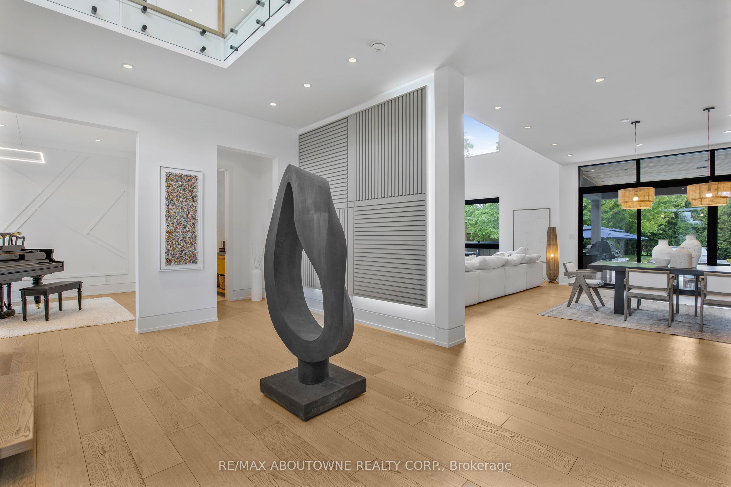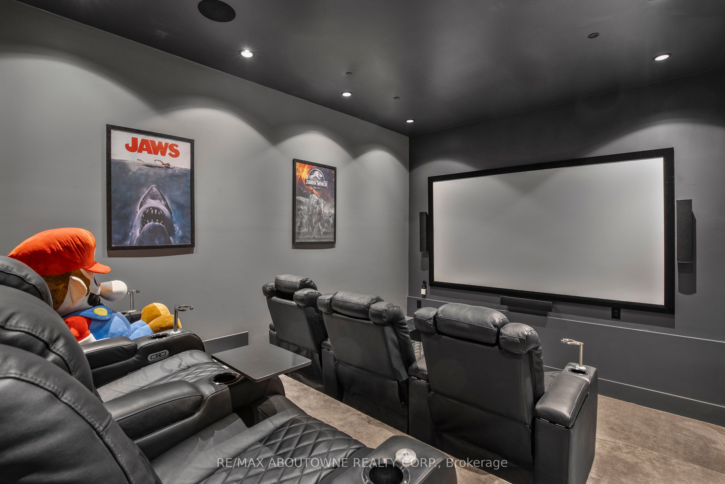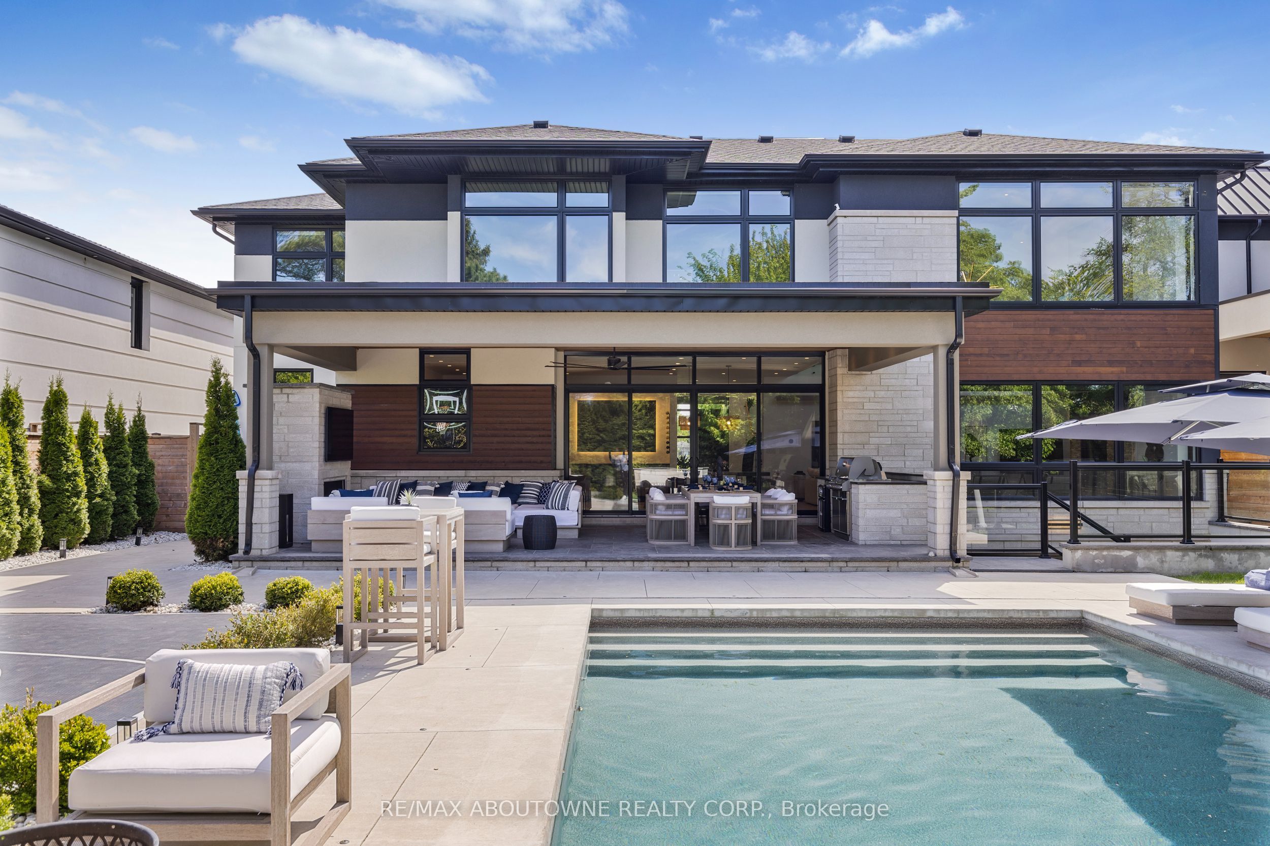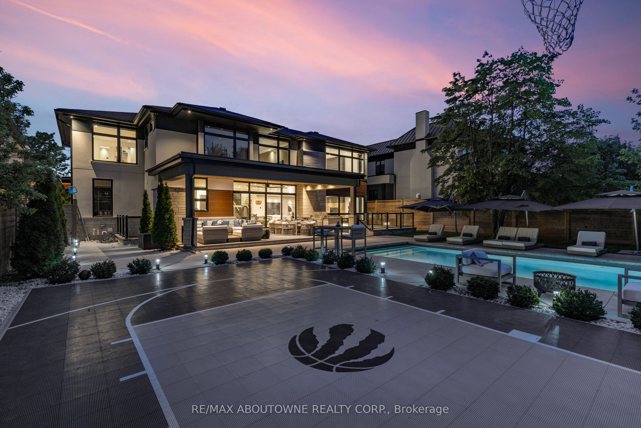 Stunning custom-built modern home designed by David Small located in West Oakville. This 2-storey, 5-bedroom, 5 bathroom residence spans over 4,000 square feet of above grade living space and has approx. $250,000 in recent upgrades. The grand foyer features 20-foot ceilings and large windows that allow natural light to flood the area. The open concept main level offers panoramic views and leads into the living area, also featuring 20-foot ceilings & Lutron Control 4 Lighting system. Sleek designer kitchen is equipped with custom-made Scavolini cabinets, high-end Dacor appliances, a cooktop stove, and a large walk-in pantry. The spacious family room includes a gas fireplace and large sliding glass doors that provide access to the fully fenced private backyard, complete with an inground pool, basketball court, and entertainment area. The 2nd level boasts a stunning primary bedroom with a 5-piece ensuite, double sinks, & walk-in closet. Additionally, there are 3 more generous bedrooms; 2 of which share a 4-piece Jack & Jill bathroom, & another with ensuite privileges as well as a laundry room completing the 2nd level. The fully finished lower level features heated floors, recreation room with gas fireplace, large gym, ample storage space, another bedroom, a 3-piece bathroom, a state-of-the-art theatre room, & a walk-up to the stunning backyard. The backyard has been meticulously landscaped and features a basketball court, fireplace, inground pool, inground sprinkler system, Lutron lighting system, and an entertainment area. Additional amenities include garage car lift, Scavolini closets, two furnaces, two air conditioners, Hunter Douglas motorized blinds, security film on all windows and a paved driveway accommodating up to six cars. Located within walking distance to several top schools, restaurants, Lake Ontario, coffee shops, and minutes from downtown Oakville, the QEW, and Appleby College. Do not miss the opportunity to own this exceptional home.