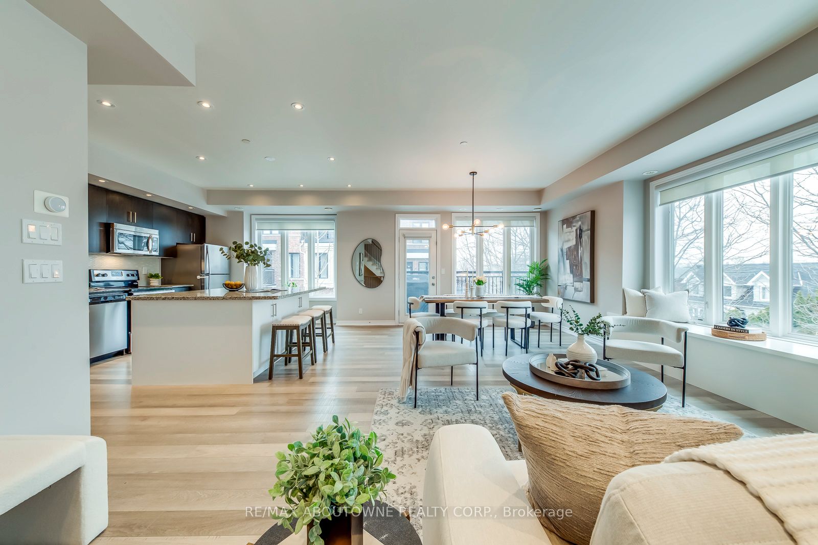 Bright, beautiful, and genuinely one-of-a-kind! This end-unit corner townhome elevated on the second level with SE exposure and tranquil treetop views, has natural light flooding through grandly-scaled windows & has to be experienced to be understood. This is a city living with a rare sense of calm. With one of the best layouts in the development, this 1,612 sq ft of wonderfully proportioned interior space, 9-foot ceilings, and a vast open-concept living and dining room, the main floor is as functional as it is beautiful. The gourmet kitchen anchors it all; an oversized island destined to become the heart of your home, ample cabinetry, and generous prep space. Custom built-in bench seating with hidden storage, a main-floor powder room, and an abundance of clever storage complete a floor plan that just makes sense. Three generously sized bedrooms sit peacefully above it all, including a primary suite with walk-in closet and private ensuite. A secondary bedroom with its own walkout balcony perch among the treetops - a quiet, unexpected delight. A private terrace below for long summer evenings. An owned storage locker and underground parking to round it out beautifully. Quite simply, a home that combines the soul of a house with the ease of condo living - nestled in an intimate Etobicoke community with every urban convenience at your doorstep. Warm, considered, and very easy to love.